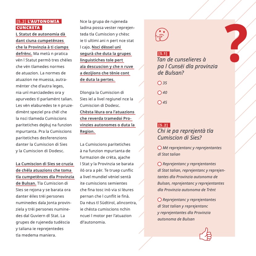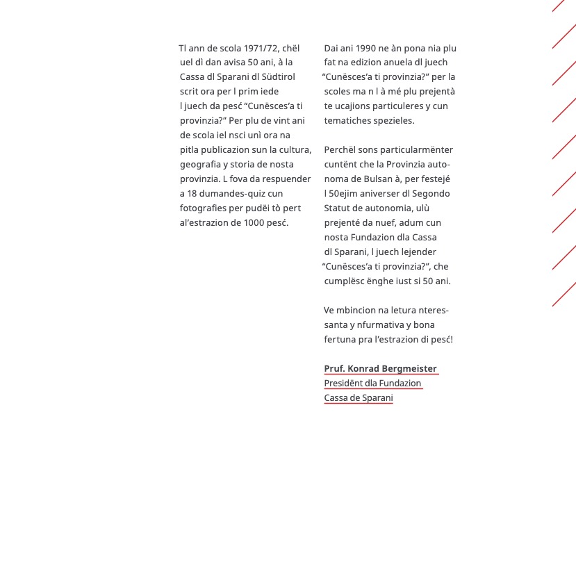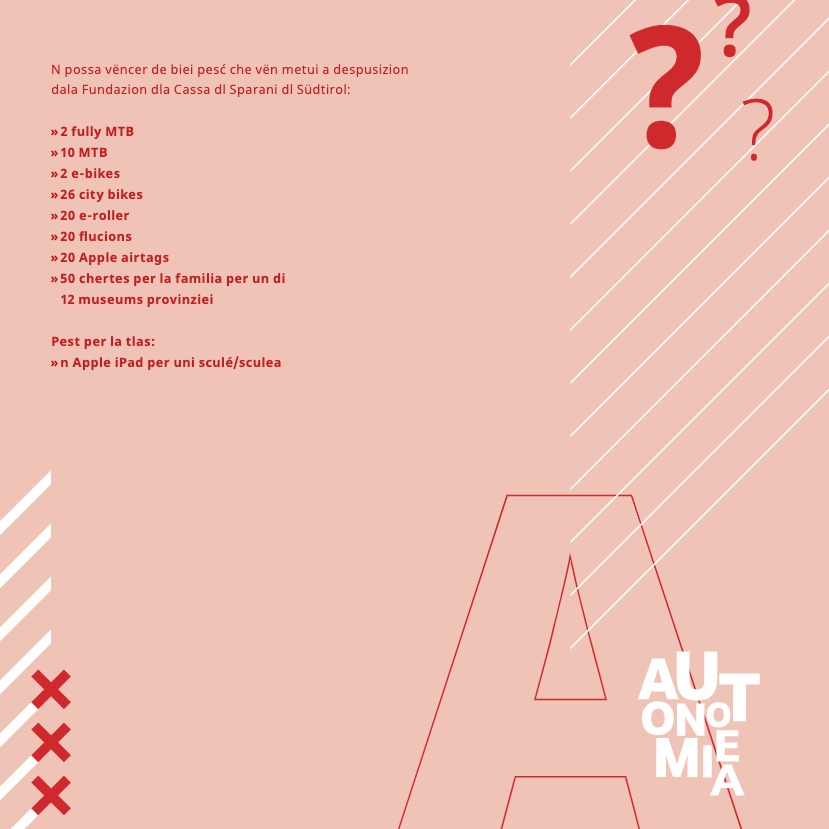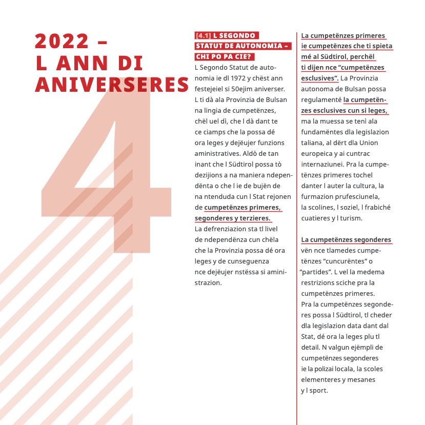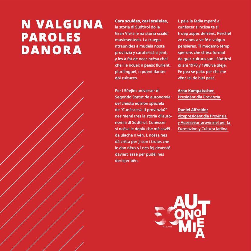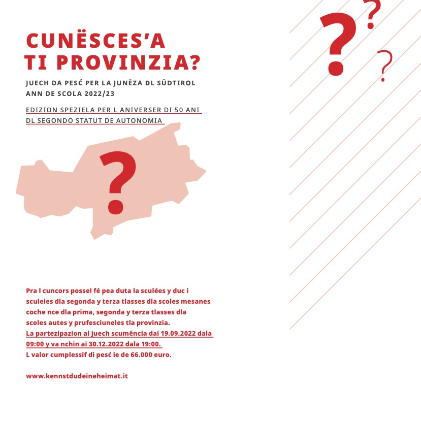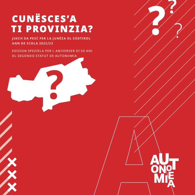 - Per l 50ejim aniverser dl Segondo Statut de autonomia urganisea la Provinzia autonoma de Bulsan n culaburazion cun l Eurac Center for Autonomy Experience y la Fundazion Cassa dl Sparani l cuncors “Cunësces’a ti provinzia?”.