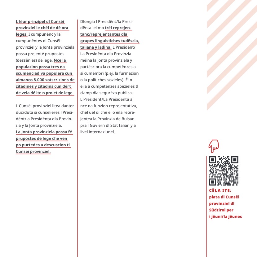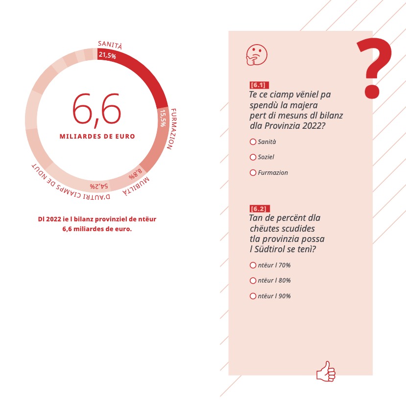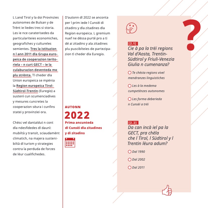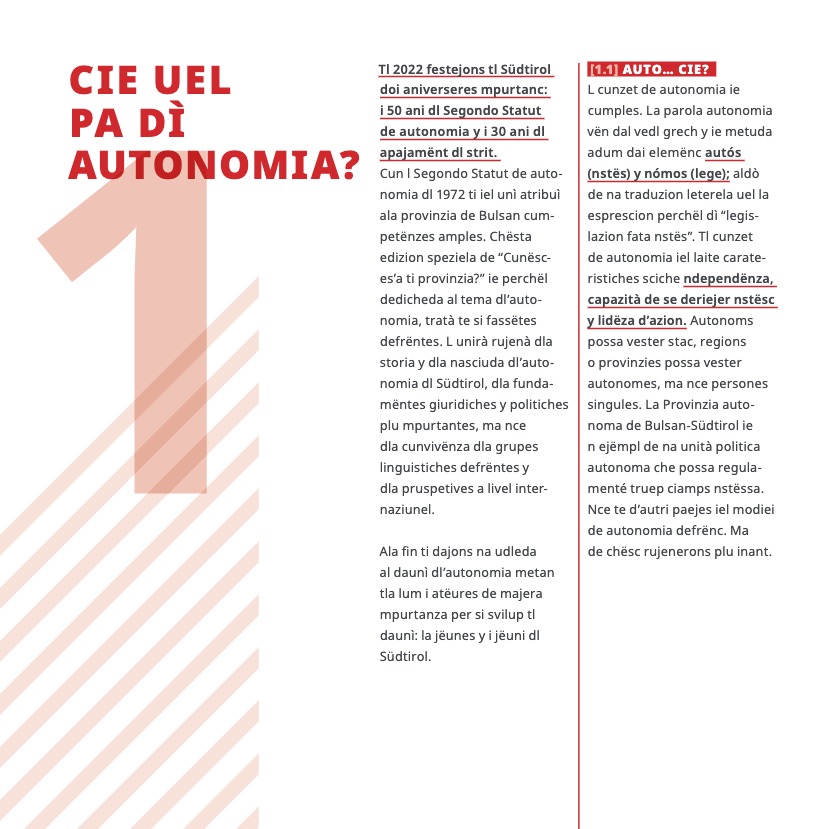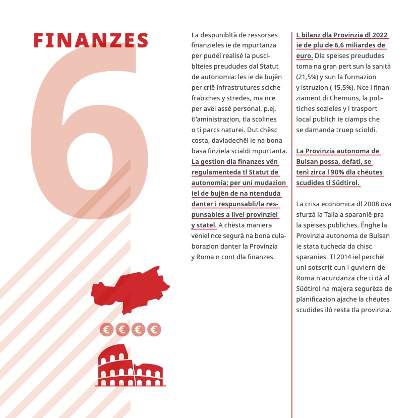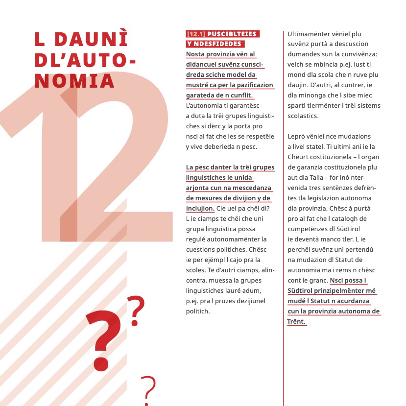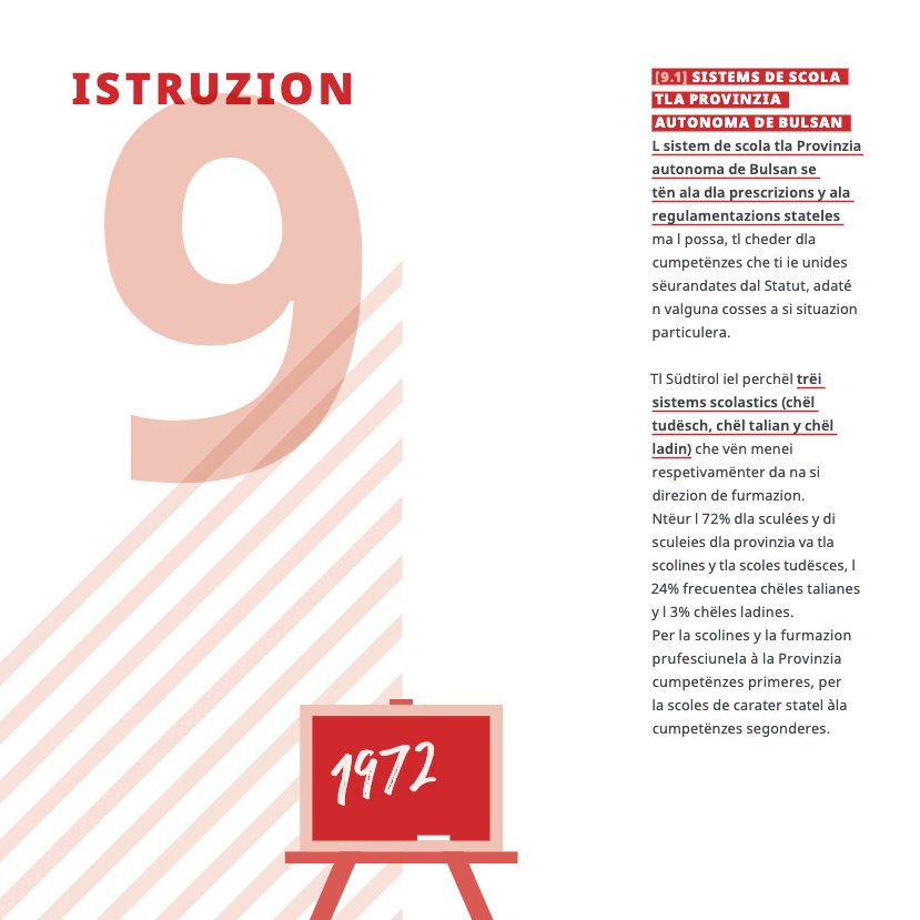 - Per l 50ejim aniverser dl Segondo Statut de autonomia urganisea la Provinzia autonoma de Bulsan n culaburazion cun l Eurac Center for Autonomy Experience y la Fundazion Cassa dl Sparani l cuncors “Cunësces’a ti provinzia?”.