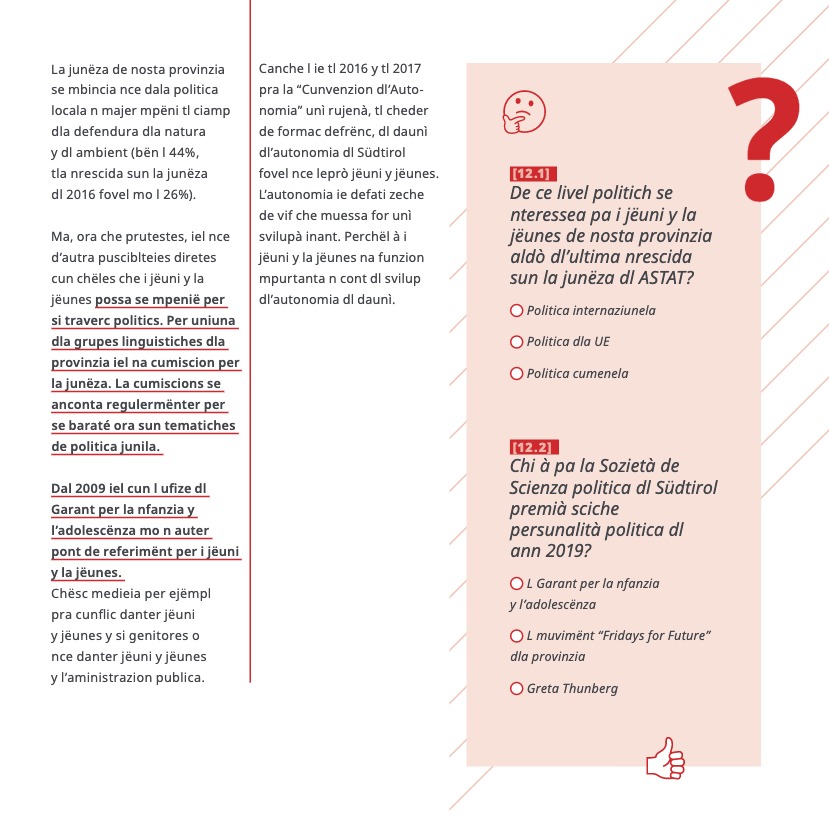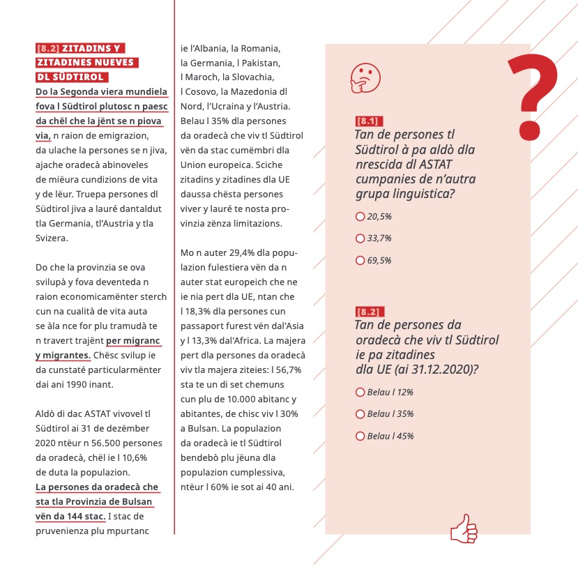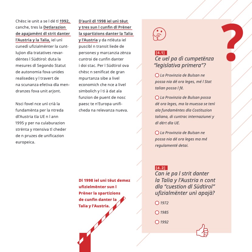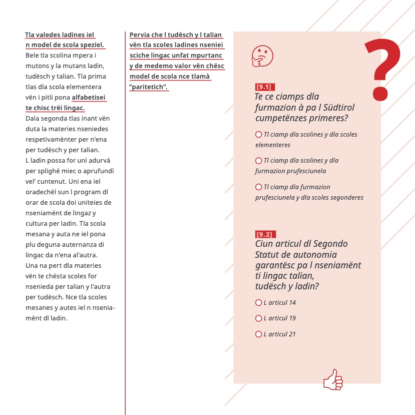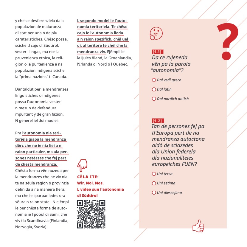 - La sculées y i sculeies giapa tl scumenciamënt dl ann de scola na brosciura sun la tematica dl’autonomia. Chësta cuntën 24 dumandes multiple-choice cun respetivamënter trëi pusciblteies de resposta. Per uni dumanda iel mé una na drëta resposta.