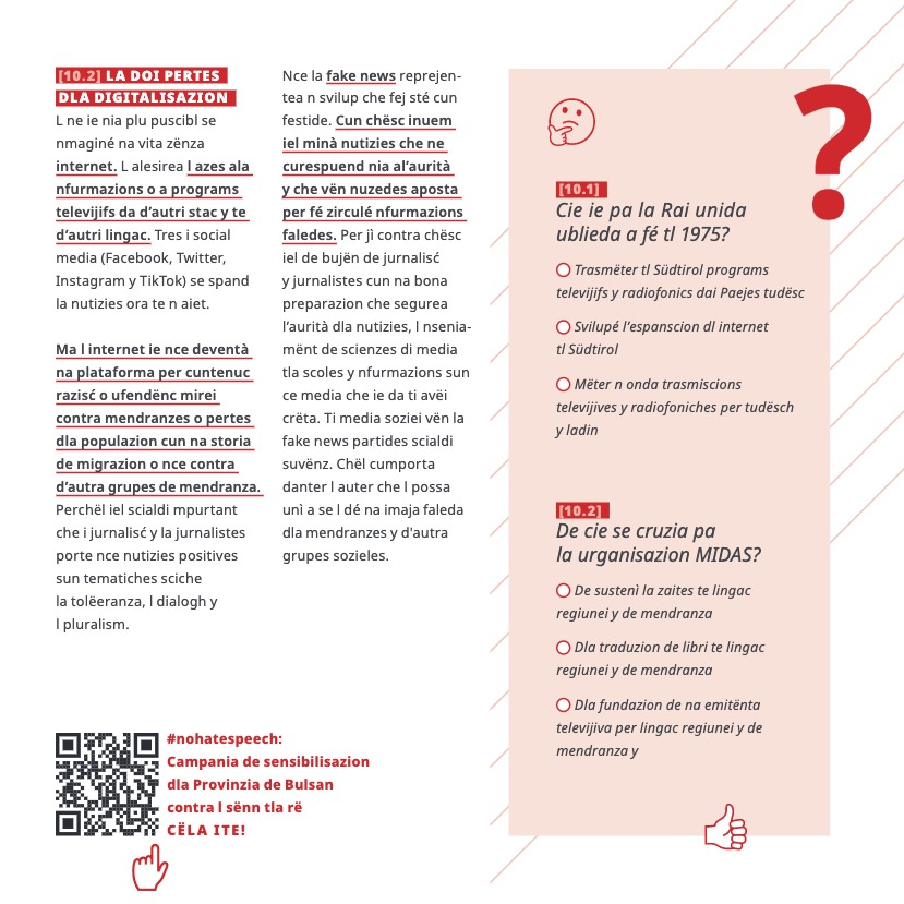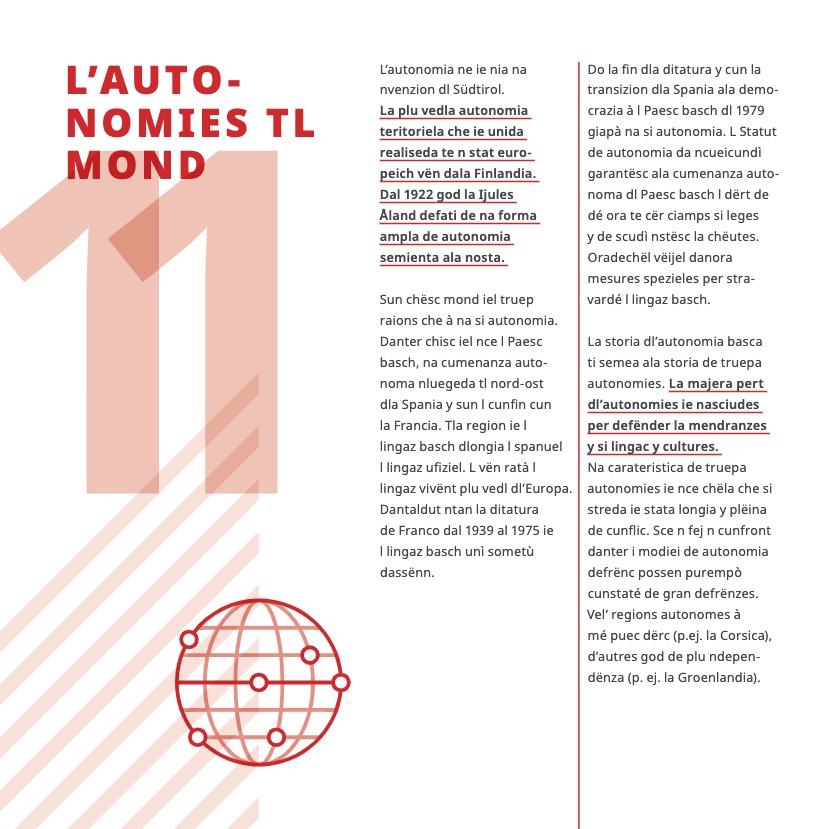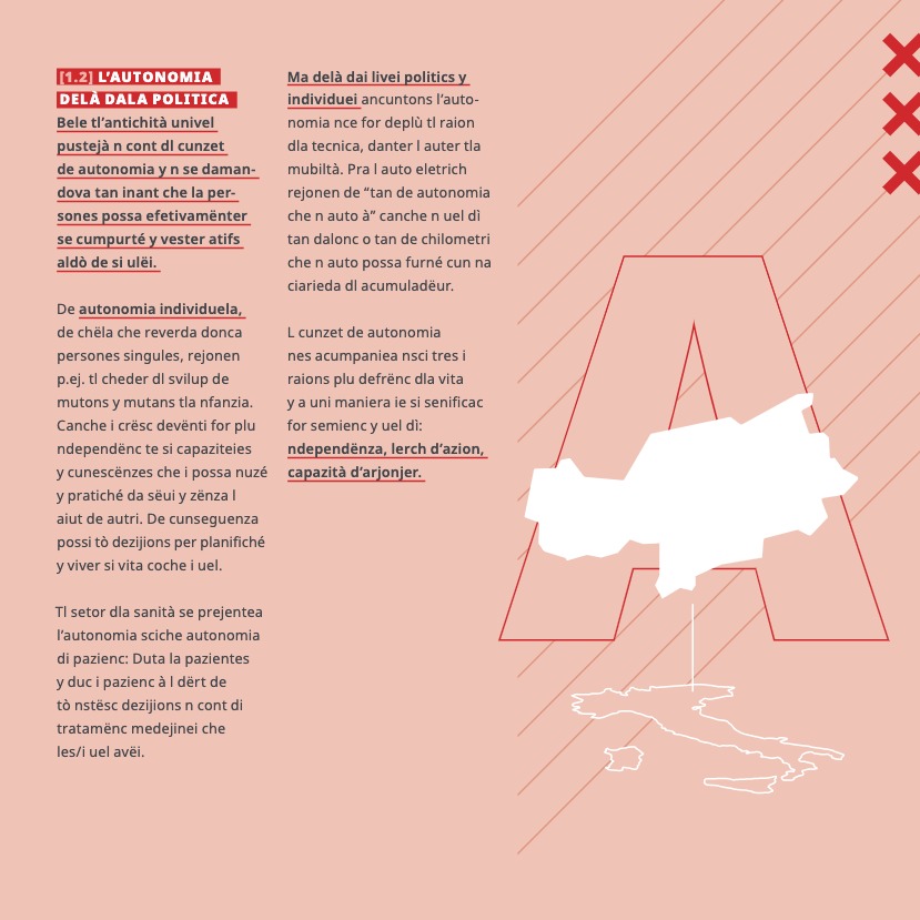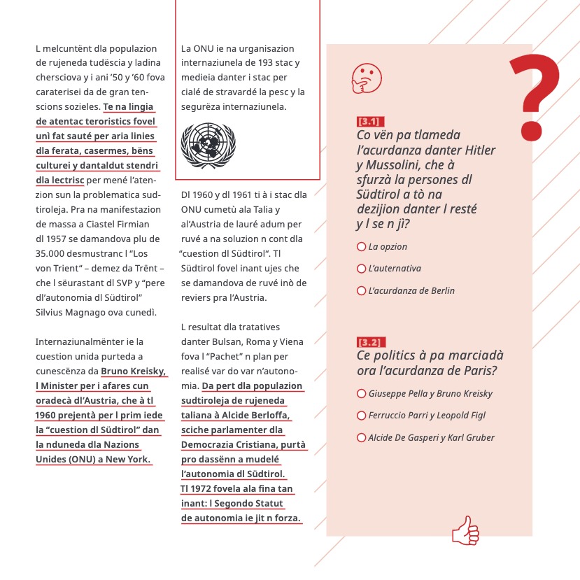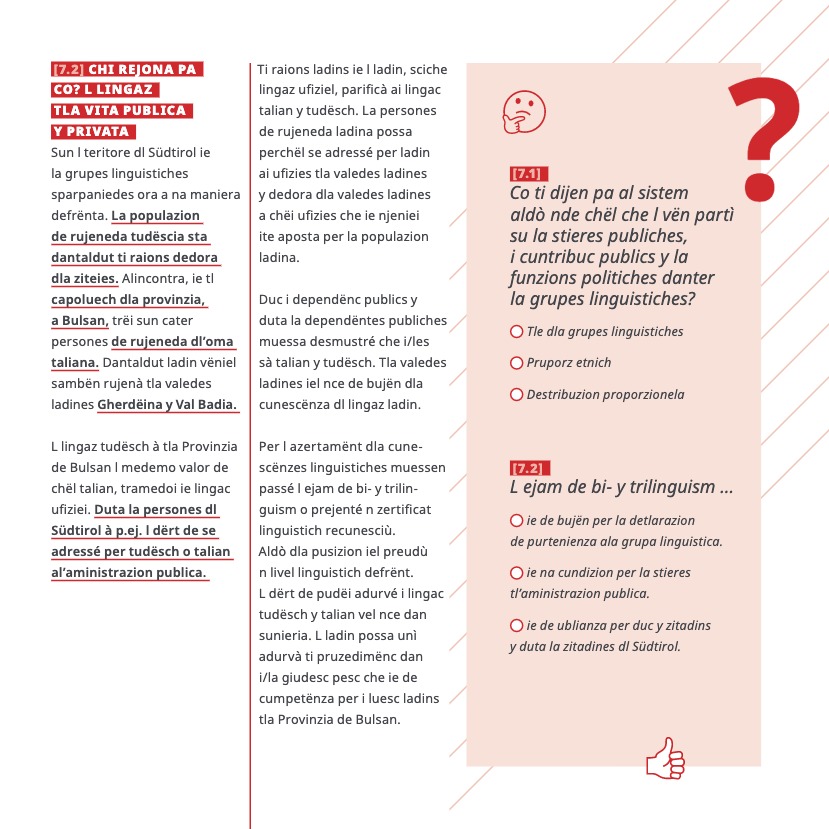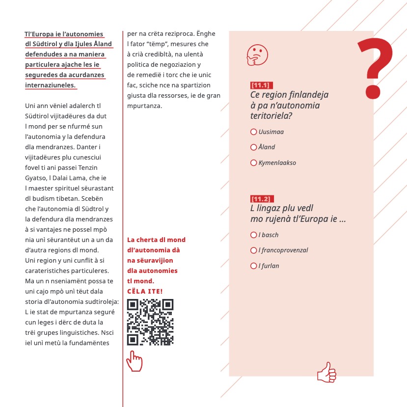 - La sculées y i sculeies giapa tl scumenciamënt dl ann de scola na brosciura sun la tematica dl’autonomia. Chësta cuntën 24 dumandes multiple-choice cun respetivamënter trëi pusciblteies de resposta. Per uni dumanda iel mé una na drëta resposta.