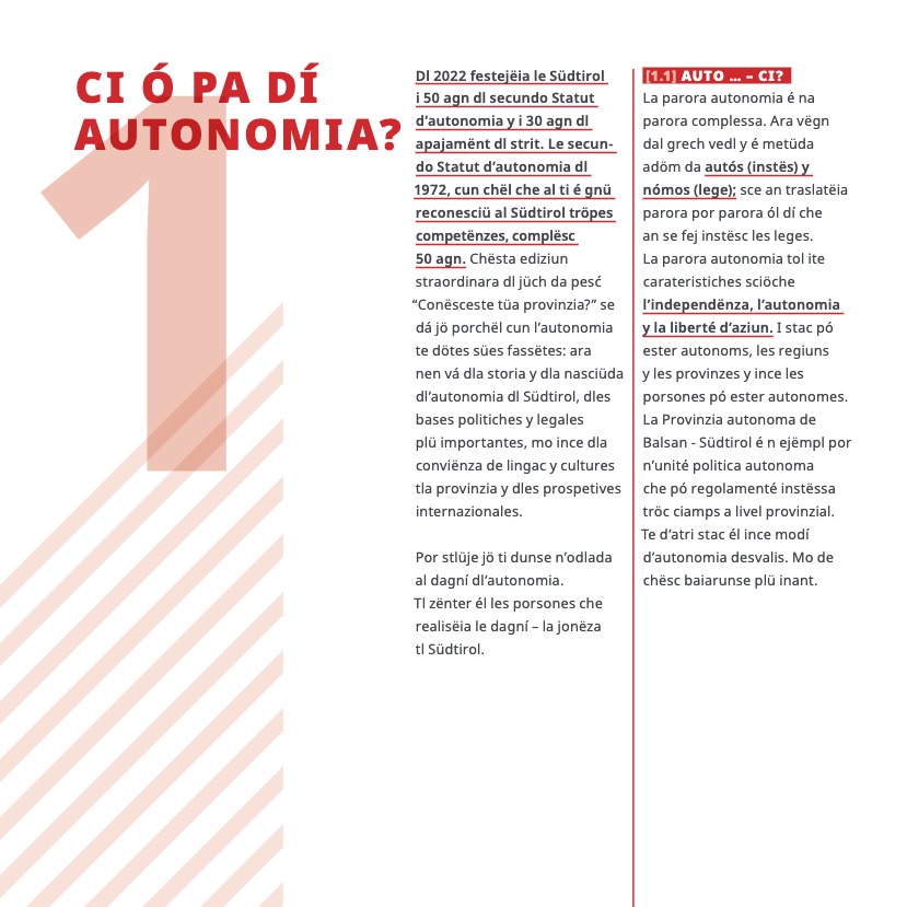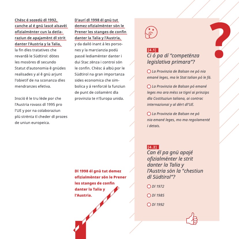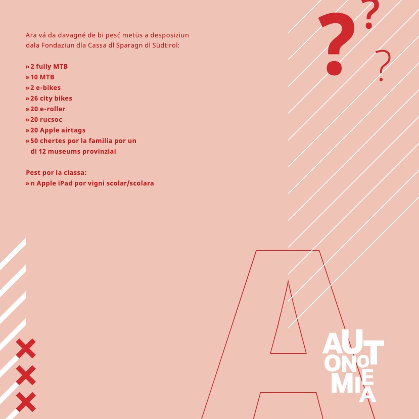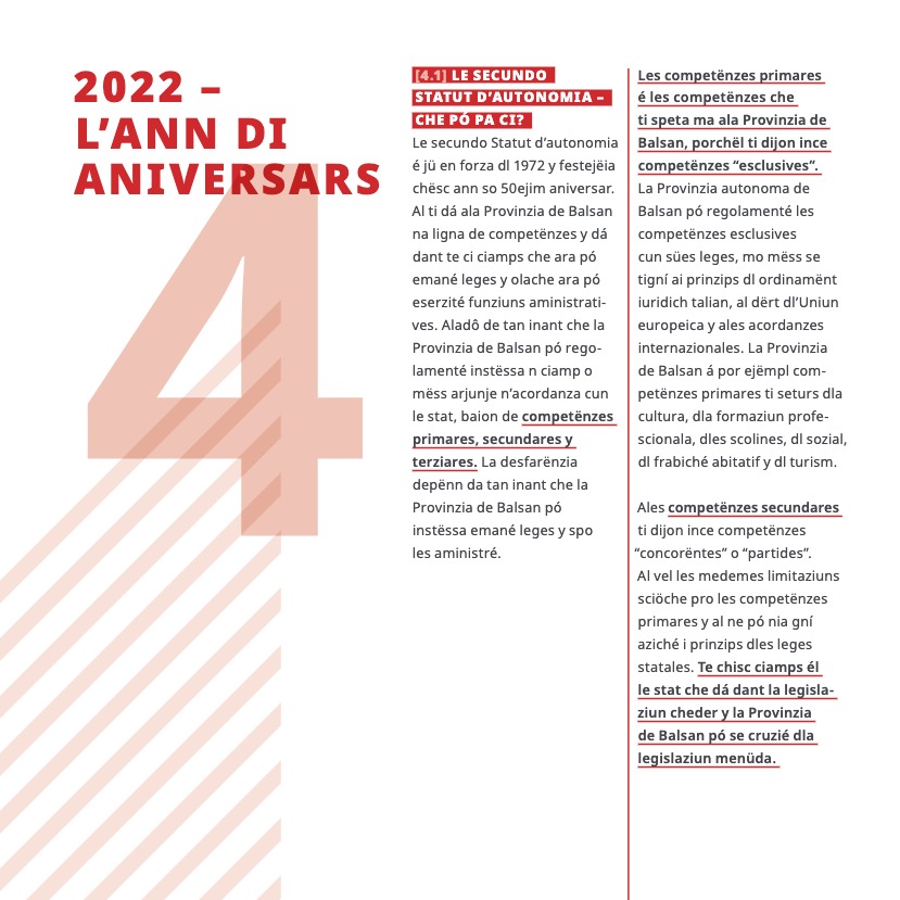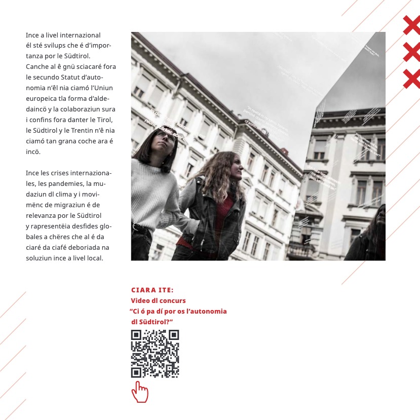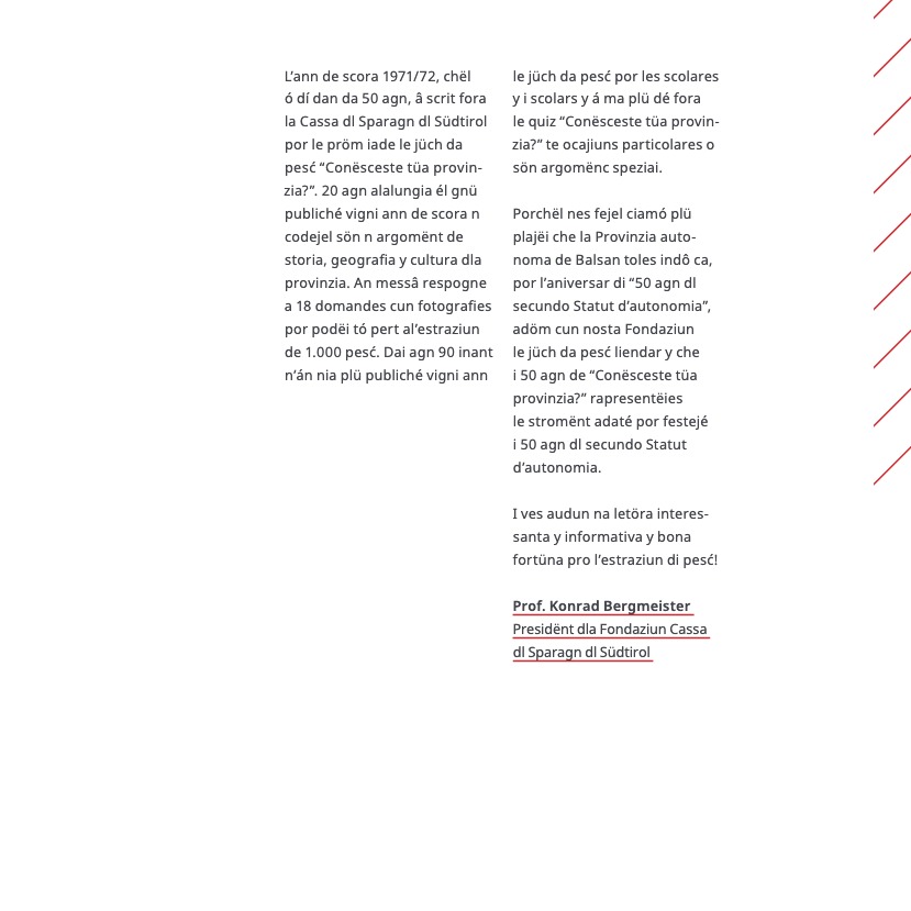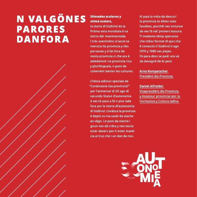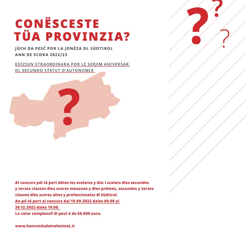 - Por l’aniversar di 50 agn dl secundo Statut d’autonomia mët a jí la Provinzia autonoma de Balsan en colaboraziun cun l’Eurac Center for Autonomy Experience y la Fondaziun Cassa dl Sparagn dl Südtirol le concurs “Conësceste tüa provinzia”.